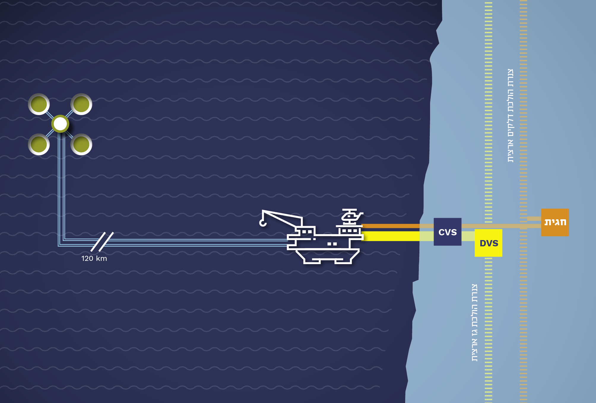 הגז הטבעי מוזרם מהמאגר אל אסדת הטיפול באמצעות 2 צינורות שאורכם כ- 120 ק"מ. במקביל להם מונחים 3 צנורות תפעול, המשמשים בין היתר לצורך החזרתו של החומר נוגד הקפאון מהאסדה אל המאגר לטובת שמוש חוזר.